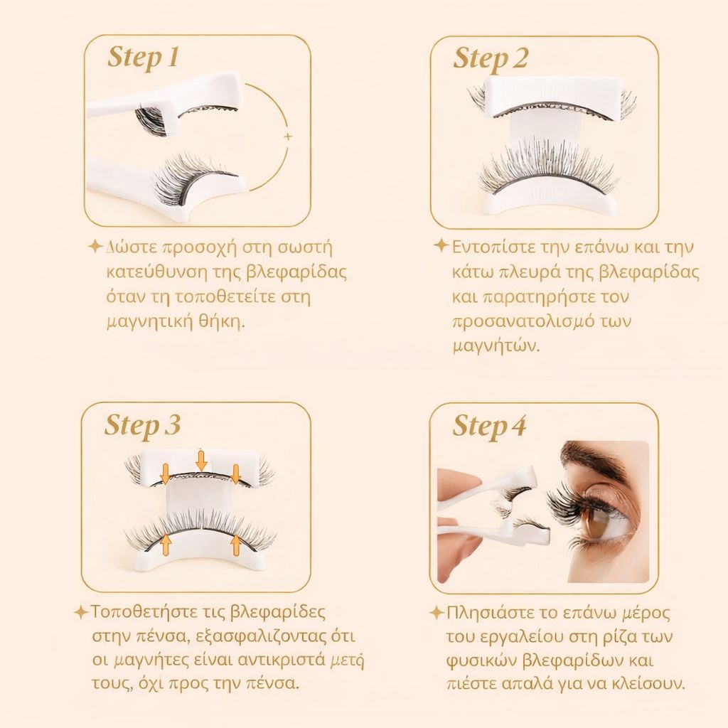 Χάρη στην τεχνολογία διπλού μαγνήτη, οι βλεφαρίδες κουμπώνουν μεταξύ τους και αγκαλιάζουν απαλά τις φυσικές σας βλεφαρίδες, προσφέροντας σταθερή και άνετη εφαρμογή.